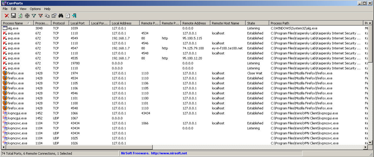 CurrPorts - информация об открытых портах и установленных сетевых соединениях